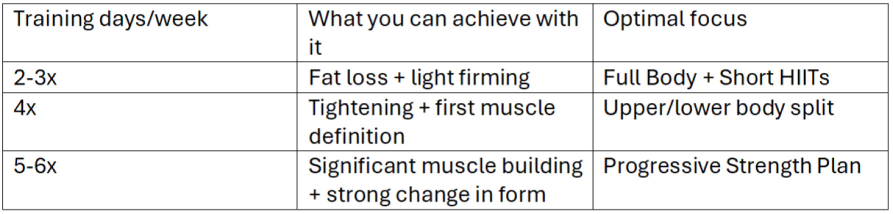 β’ 3β5 workouts/week, a mix of strength training and short HIIT bursts