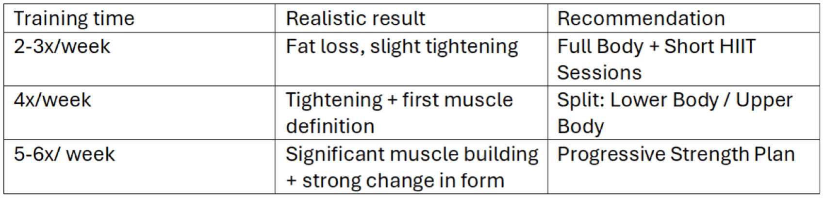 β’ Training: 3β5 sessions/week, a mix of strength training and short HIIT bursts.